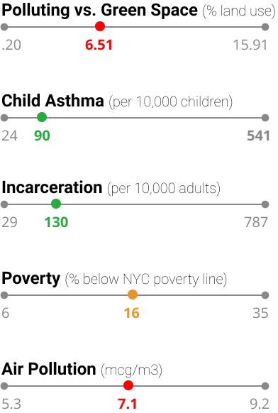 Williamsburg and Greenpoint are energetic neighborhoods, located in Brooklyn’s Community District 1, known for their long industrial history followed by more recent gentrification. However, their industrial past leaves a difficult environmental legacy. A toxic plume beneath Greenpoint, stemming from decades of industrial pollution including oil spills, an incinerator, and hazardous chemicals, as well as a disproportionate share of NYC’s waste processing and heavy traffic on the BQE adversely affect the air quality of the region. These environmental issues persist despite ongoing cleanup efforts, leaving the neighborhood with some of the worst air quality in the city. Despite these issues, residents of Brooklyn CD1 tend to be wealthier than the NYC average, with lower rates of incarceration and child asthma.